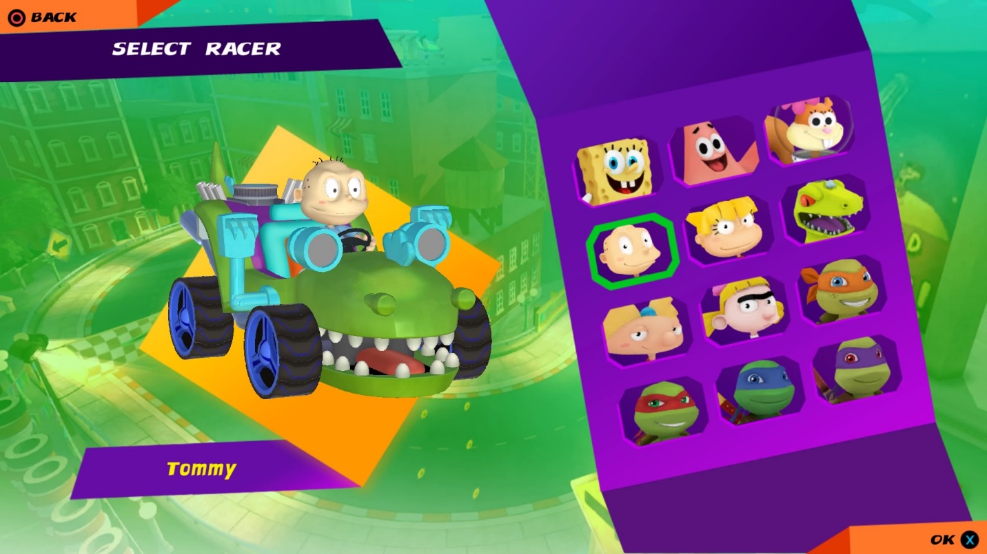 That 12 characters however comes with their own special attacks to keep each character unique aside from the general power-ups that anyone can use. Spongebob has his jellyfish attack that simply blinds you with a swarm of jellyfishes while Patrick Star would throw his pet rocks at you from behind. Sandy has her lasso to latch on you while propelling her forward. Tommy Pickles from the Rugrats however has his gigantic ball that gets thrown to stop you in your tracks and her sister Angelica has her pack of cookies to give her the sugar rush and speed boost for three consecutive uses. Reptar on the other hand is similar to Patrick but instead of throwing rocks, he breathes fire to shoot people in the front. The turtle brothers, Leo, Raph, Don and Mikey has their shuriken shots, ramming ability, gadgets and nunchuks respectively. Helga with her football-shaped… sorry! I mean Arnold-shaped bubble gum art can put her enemies in a yucky mood as their tires get slowed down with it. Arnold the pigeon man gets propelled to the front by a swarm of pigeons that also includes invincibility and auto-drive similar to getting the all-star power up from Sonic All Stars Racing Transformed.