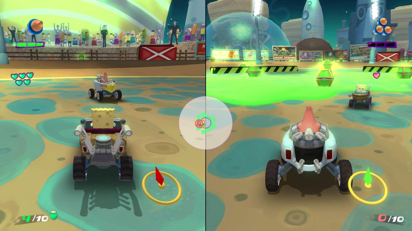 With only 12 characters available between the four previously mentioned series, it’s as barebones as Sheldon J. Plankton. Having only the bare minimum game modes from your average single-player content like Grand Prix and Free Race with both solo and team modes or Time Attack. Multiplayer modes however does not include an online mode but your average split-screen couch-coop races from Grand Prix, Free Race with both modes and Battle Arena where players of up to four fight it out in an arena be it free-for-all, capture the flag or Tag. There’s two dozens of game maps that can and will change depending on the current lap as it closes and open new ways to progress.