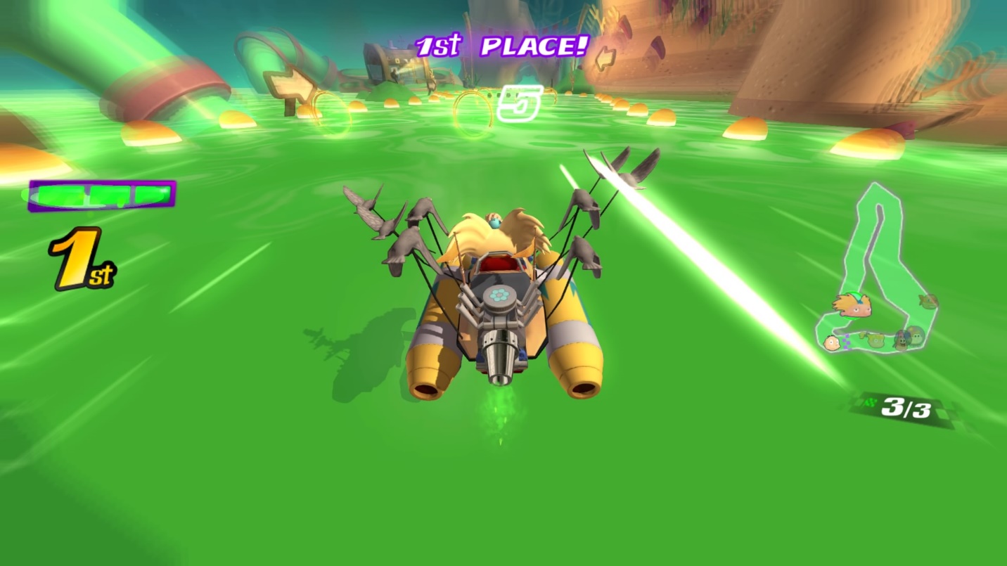 Speaking of Sonic All Stars which honestly looks very similar, Nicktoon racers can transform their karts based on the terrain aside from the customization of specific parts that we’ll talk in detail later. Like I said, transformation. Seems like an awesome feature but honestly never liked that on Sonic and never will on NKR. Transformation itself is simple in which wheels get replaced by jet skis when in a gooey sea of slime or adds wings when taking huge jumps to which you can glide up or down. While the gliding is bearable, out-maneuvering an enemy racer in a sea of slime isn’t. What makes racing game fun to me is the ability to drift and get rewarded with a brief boost however that is not possible while in Jet Ski mode. Much more so when there are maps made exclusively in an endless sea of green slime.