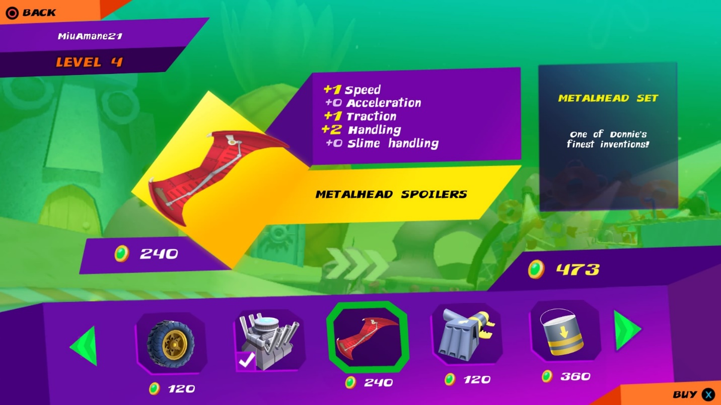 Moving on, if there really is such a word as move on. Karts have their own customizations… from the default wheels, engine, gliders, jet skis and paint job, you can buy or unlock new items from the in-game shop of up to a total of nine sets or 45 customization options. That’s a total of 59,049 possible combinations for one character alone and 708,588 combinations for all twelve racers. If my math is right! Each of those parts has their own stats be it a +2 on speed or acceleration or maybe better handling with a +4 on slime. Paint jobs however are just that… a splash of paint!