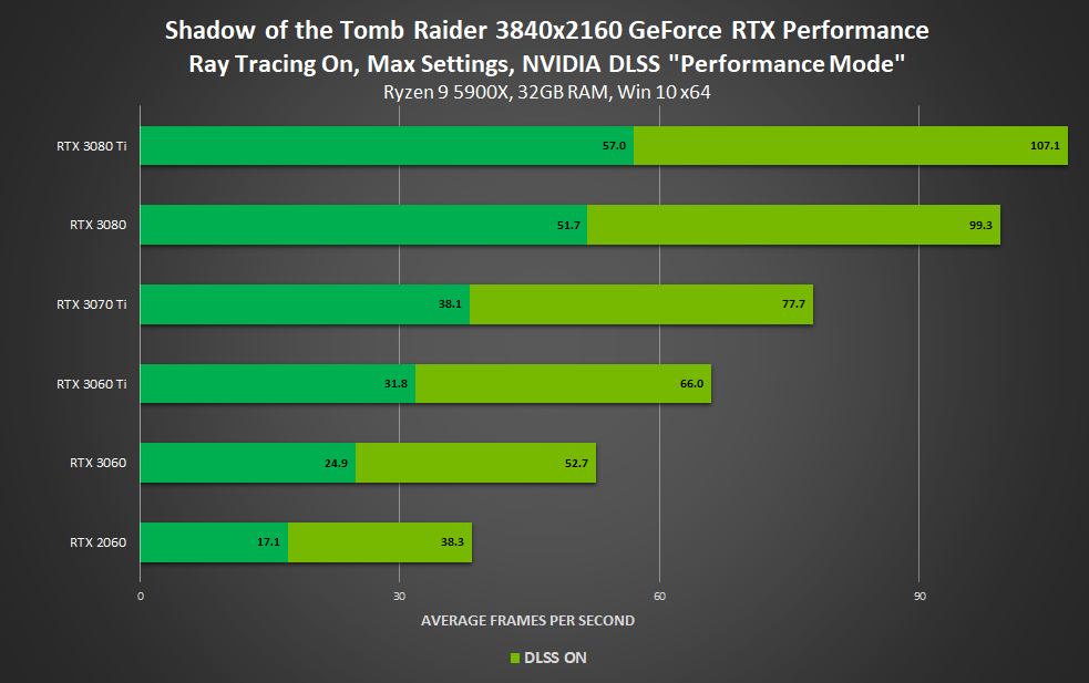 In Shadow of the Tomb Raider, NVIDIA DLSS performance more than doubles at 4K, with max settings and ray tracing enabled: