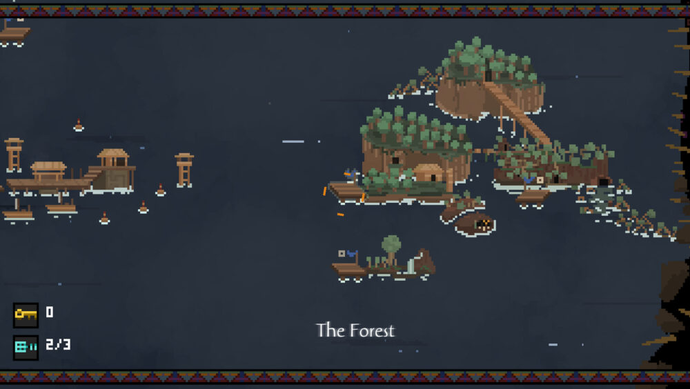 The balance of traversal, combat, puzzles, and narrative sequences is one of Olija’s strong points. The action moves at a brisk pace, and it is rare that you will traverse more than a handful of screens defeating foes, before being presented with a puzzle sequence, a challenging boss encounter, or a beautifully animated interaction with the princess Olija and her retinue. Each island cluster you visit offers up new scenery and tougher enemies while defeating the boss will provide a short cutscene that fleshes out the story and directs you to another part of the archipelago.