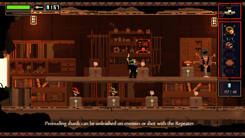 As you tear through enemies and destructible objects (think supply crates, fauna, and foliage), you will accumulate currency and crafting materials. Currency gives you the ability to add new facilities to your outpost, upgrade your health pool at an alchemist, or send out expeditions for random crafting rewards. Both currency and crafting materials are used for crafting magic hats, which grant unique buffs to your attacks that can alter how you play and influence your choice of secondary weapons. Once a combo meter is filled, you can unleash devastating area-of-effect attacks, add explosive shrapnel to your rifle shots, or charge your harpoon with electricity to name a few. My personal favourite, and one that got me out of trouble numerous times, was a hat that granted a life steal – perfect when used in combination with the rapier, which quickly builds up the combo meter in a flurry of strikes.