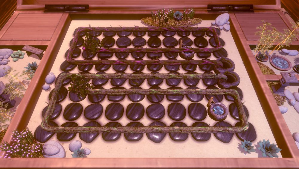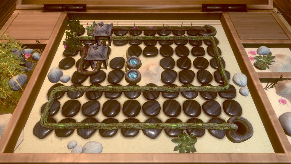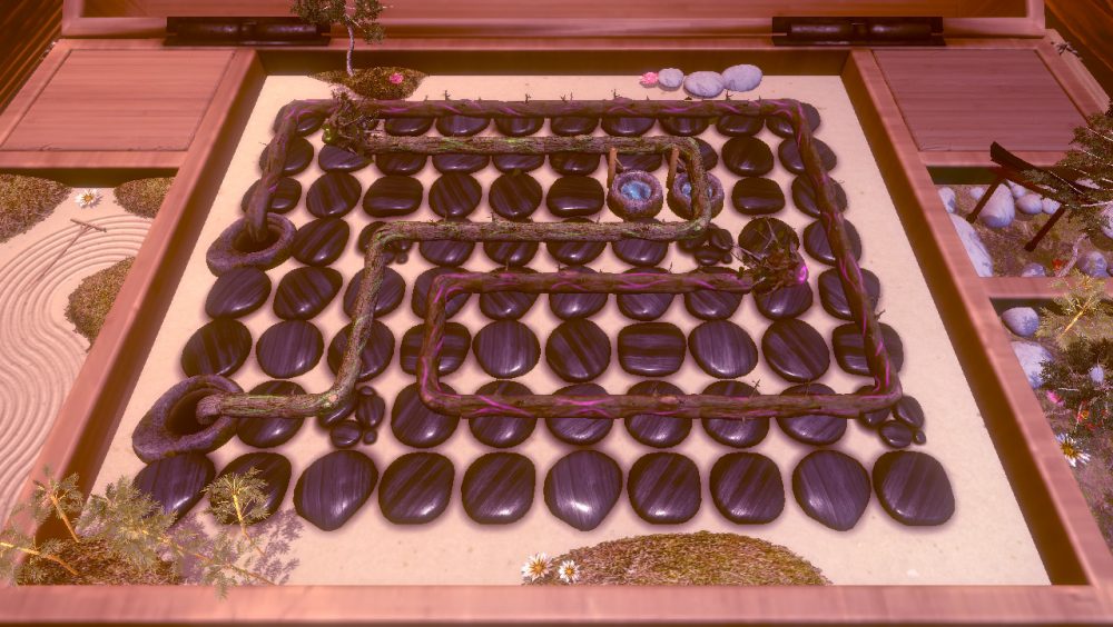 Until you reach these final steps of OmoTomo, however, the entire experience is a delight. The look and feel of the game are heavily inspired by Zen gardens in style and emit the same peaceful and intriguing feelings as their inspiration. The creatures themselves are mildly disturbing at first, but the use of happy artworks and gentle, pleasant animations soon transition them to feeling oddly cute and harmless. The audio of the game is peaceful for the most part too, apart from the jarring musical loop which comes from dwelling on a level for too long. Traditional and gentle in nature, the whole game attempts to enshrine you in a focused and relaxed experience, and largely does so successfully.