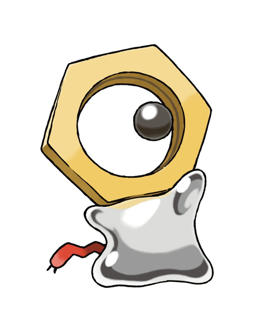 Meltan is a Steel-type Pokémon with a body made mostly of liquid metal, which makes its shape very fluid. This Pokémon can use its liquid arms and legs to corrode metal and absorb it into its body. Meltan can generate electricity using the metal it absorbs from outside sources. It uses this electricity as an energy source and for an attack it fires from its eye.