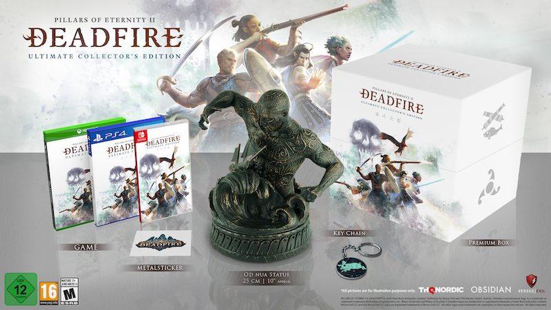 Consumers can digitally purchase the Pillars of Eternity II: Deadfire Ultimate Edition through the Microsoft Store and PlayStation Storefronts. Deadfire is also available as a physical release from today in the form of a Standard Edition and the Ultimate Collector’s Edition courtesy of THQ Nordic for Xbox One and PlayStation 4 at an SRP of €59.99 | $59.99 | ÂŁ49.99 and €129.99 | $129.99 | ÂŁ119.99, respectively. The Ultimate Collector’s Edition will contain the following items.
