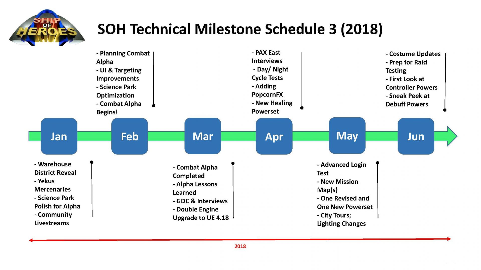 - Ship of Heroes has just published their third technical schedule, showing the milestones planned for the first six months of 2018. This particular schedule covers the first six months of the year, which included a successful Combat Alpha. It also covers the next big thing, which will be a login and network test. It also hints that the third quarter of 2018 will include some kind of raid test.
