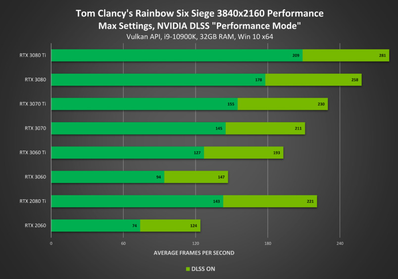 Rainbow Six Siege added NVIDIA DLSS today which was made available via a game patch. NVIDIA DLSS is supported in the Vulkan version of the game and boosts performance by up to 50% at 4K, enabling all GeForce RTX GPUs to game at 100+ FPS at 4K.