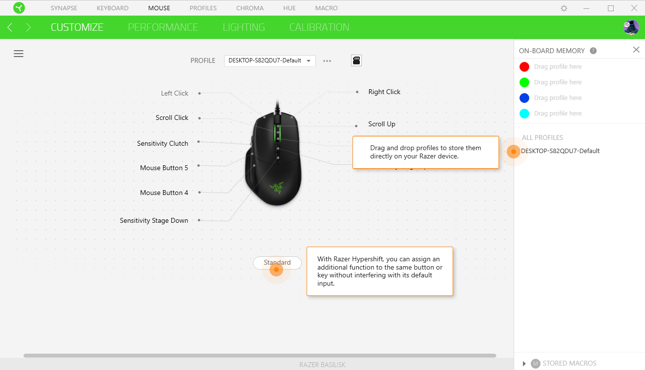 Thanks to Razer’s new Hybrid Storage, which is basically a small amount of memory within the device, you can now save up to 5 different profiles on the mouse itself, which can be accessed via the profile button under the mouse. By having onboard storage, it takes away from always having to access the software to change a profile, or using up one of the buttons on the mouse to assign it to change profiles.