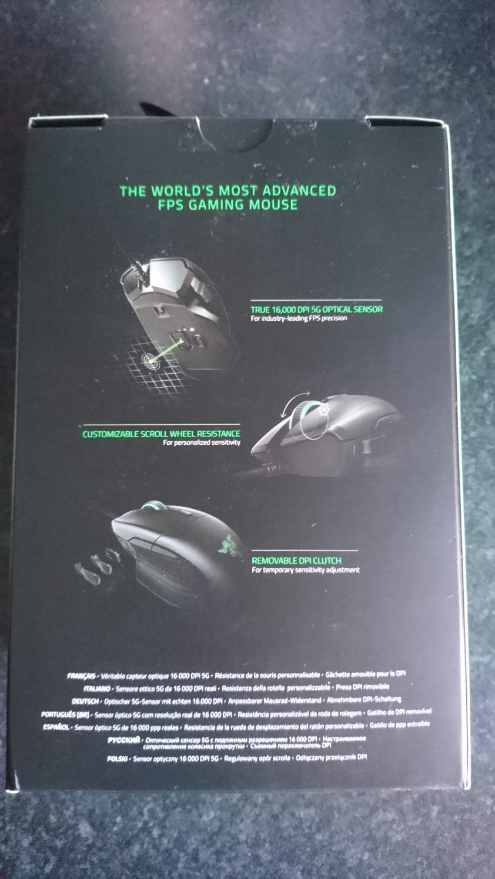 The front showcases the mouse from a top-down view, with the Razer logo on the top right-hand corner and in the left-hand corner is a sticker that states;