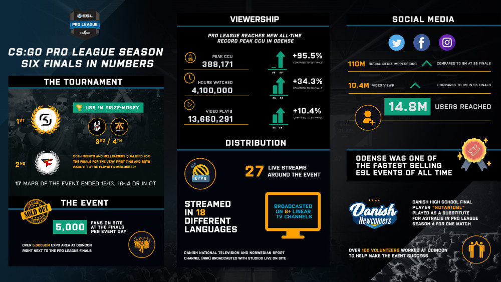 The sold out Sparekassen Fyn Arena in Odense welcomed more than 5,000 fans on each of the three main event days, and will go down the history books as the fastest selling CS:GO Pro League Finals event of all time. The Finals reached some record-breaking viewership numbers with a digital peak of over 388,000 concurrent online viewers (excluding China), marking a 95% growth compared to the Season Five Finals that took place last June in Dallas, and a new all-time record for Pro League. More than four million hours of content have been consumed through 27 live streams in 18 languages and eight linear TV broadcasts, a 34% increase from the previous Pro League Season Finals. Throughout the tournament, 110 million social media impressions have been generated on Facebook, Twitter and Instagram alone.