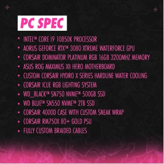 Featuring all the latest hardware, the PC included an array of premium components, ranging from an Intel Core i9 10850K and AORUS RTX 3080 XTREME WATERFORCE to the Custom Corsair Hydro X Series Hardline Water-Cooling system. Additionally sporting 16GB of Corsair Dominator Platinum RGB RAM, mounted in an ASUS ROG MAXIMUS XII HERO Motherboard, the build also featured entirely NVMe SSD storage from Western Digital’s Black and Blue series, giving the system a whopping 2.5TB of lightning-fast storage.
