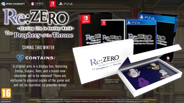 The Badge Edition includes 4 exclusive, limited run only original pins in a display box, featuring Emilia, Subaru, Rem, and a brand-new character yet to be revealed! These are exclusive to physical copies of the game and will not be reprinted, so pre-order today!