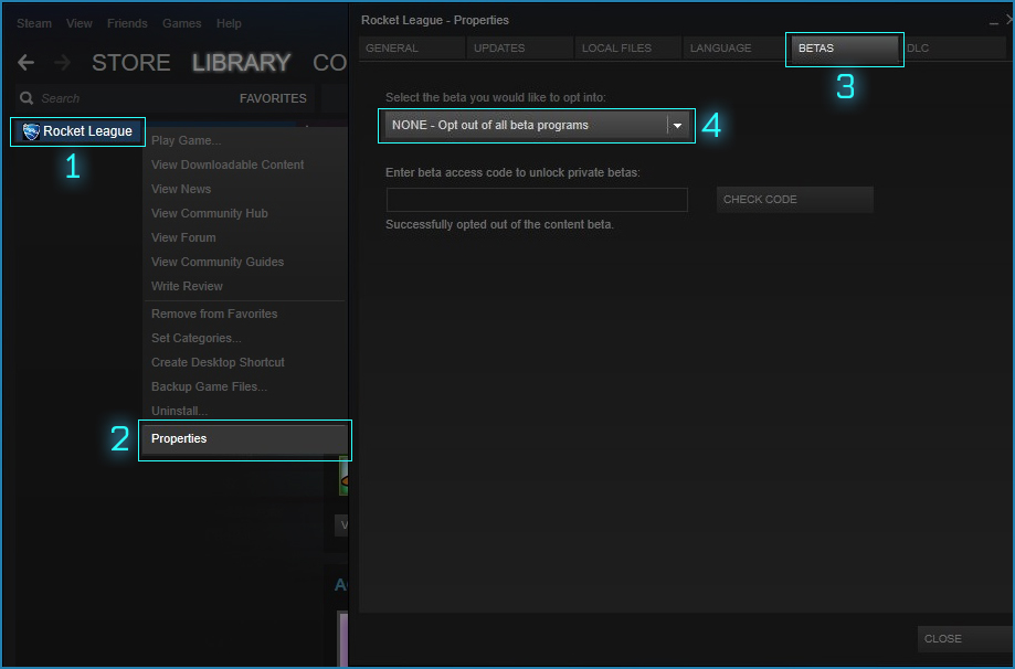 Note: If you want to disable the beta, go back to the ‘BETAS’ tab, and select ‘NONE – Opt out of the beta program,’ and Steam will then update Rocket League back to your normal ‘live’ version of the game.