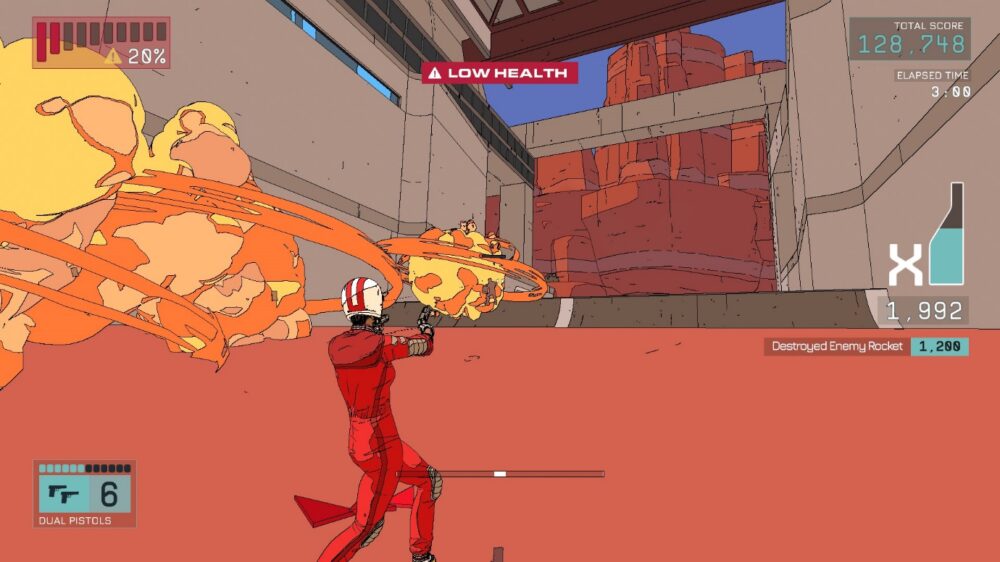 Rollerdrome looks visually appealing with a distinct art style that really pops thanks to the use of saturated colours that reminds us of a graphic novel or comic book. The effects as well as animations are spot on and Kara pulling off tricks while firing weapons never looks dull. The smoke and other effects such as mines, rockets and mechs exploding look fantastic too.