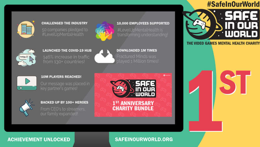 Proceeds from the 1st Anniversary Bundle will go towards the creation of Safe In Our World’s own tailored, games-focused Mental Health CBT courses, which will provide much-needed mental health support at no cost to games industry professionals and gamers alike. Gamers can choose to pay the bundle price or, if able to, can increase their donation amount to further support Safe In Our World.