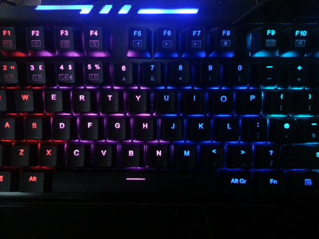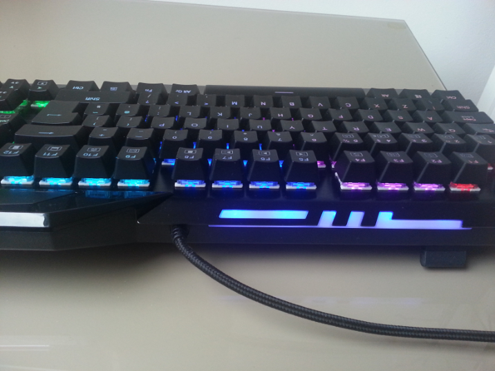 I’m actually going to skip all the physical details and by that I mean the dimensions and how much it weights, because I haven’t gone that far as to check whether all that’s true and let’s be real, nobody gives a damn. However, I can assure you, the keyboard is huge … and heavy. My laptop’s entire length is ¾ of the whole keyboard and I’d wager they weight about the same. In reality when I first laid my eyes on this keyboard, it kind of shocked me. First thoughts include “damn, this thing is huge” and “wtf, it’s so heavy”. Also yes it does have 104 keys, though I did count like 5 times, because I was always getting 105 and I am just bloody stupid. The USB cable length doesn’t even matter, I mean I use the keyboard without having unpacked the cable from that wrap thing around it, so however long it is, doesn’t matter to me, because I am on a laptop. However, strictly speaking from a point of view of plugging it into an actual stationary PC, I guess it’s long enough to reach.
