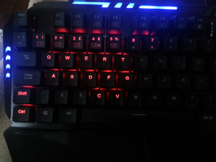 The wrist rest – though I admit at first I thought it was giving the keyboard a very weird shape on the bottom side and it didn’t look all that comforting and such … damn that thing is mega comfortable – not even kidding. When I type and my wrists fall there, I feel blessed to have it, because on my laptop, everything fell onto the length of the actual laptop, below the keys, where the touch pad is and while my last laptop had an off button for that, this one doesn’t and me being the retard I am, realized too late I can turn it off from the software … whaaaaaaat?! Mindblown … (by stupidity). Anyways my point was, that the wrist rest is super comfortable and I am very happy with it, unlike my bumpy laptop edge. And because I mentioned the shape of the keyboard, can I just take a moment and say that although, yes it does have a weird shape, it looks beautiful. Well layered out, the keys are above the plate and don’t have their own sockets and the overall shape of the keyboard gives it that high-tech feel, ya know what I mean? And the little lights on the plate are super stylish. On the note of dust, I think that it’s better that the keys don’t have their own sockets, because it’s gonna be easier to clean without having to decompose it.