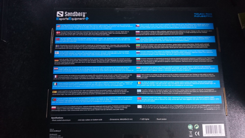 Moving to the back of the mousepad box, they discuss the pad ‘The Large surface of this mousepad for gamers provides a premium in-game precision. The mousepad will stay in place during the action, thanks to the anti-slip material on the bottom side of the pad. Made of black coated aluminum. Colour changing LED lights all the way around the mousepad, The Lights can be controlled by a single touch on the mousepad itself’. The same description is in other languages as well.