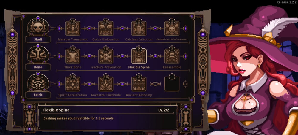 The Witch is one of the first NPCs you’ll meet in the game, and she grants you Witch Traits, which are permanent upgrades that apply to all your runs. Defeating enemies and progressing through the game will occasionally grant you Dark Quartz, which is used to buy and upgrade traits at the Witch. One of the first traits you’ll want to focus on is the Flexible Spine trait.