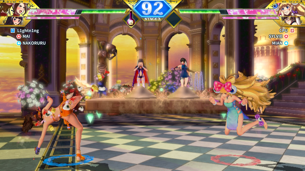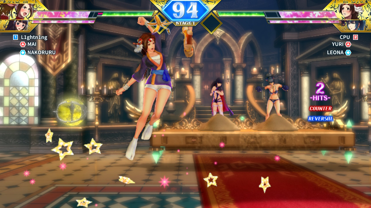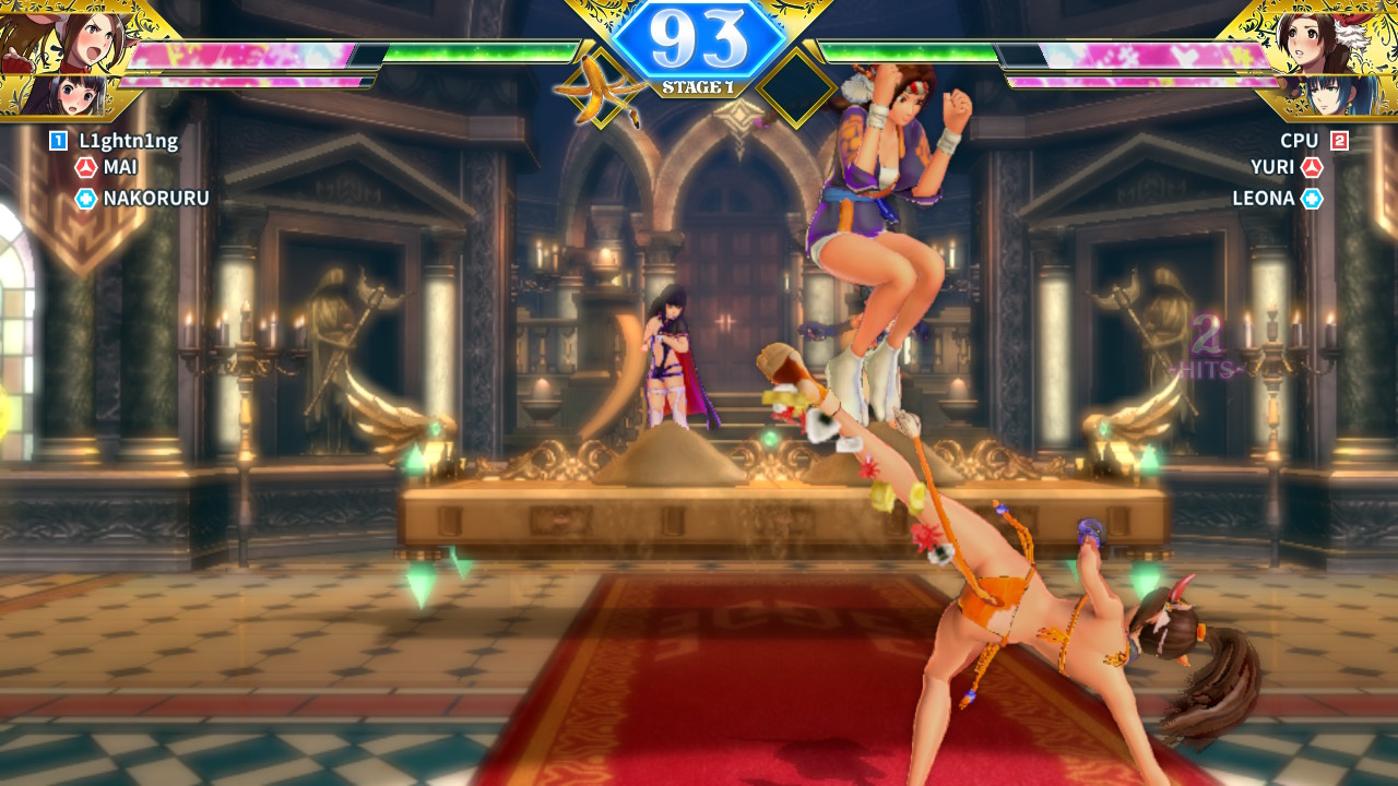 SNK Heroines: Tag Team Frenzy features a standard range of modes to choose from such as Story, Versus and Online. The Story Mode, while quite short, is worth playing through for the unlocks. Players will choose their tag team which consists of one primary attacker and a backup supporter. This tag team will face off against other SNK tag team heroines trapped in an alternate dimension where the story takes place. The evil mastermind behind the alternate dimension is a shady character known as Kukri, and while he seems to be absolutely crazy, his character is in reality quite laughable. That said, the story itself is almost non-existent anyway so Kukriβs schemes serve as a basic plot device at best.