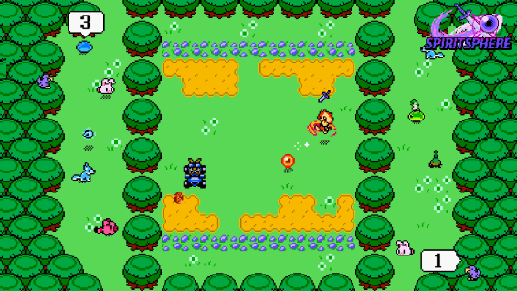 SpiritSphere, the recent title from developer Eendhoorn Games, is one such video game. Marrying an 8-bit, Zelda-inspired visual presentation with what is essentially the fundamentals of air hockey, it’s a simplistic game that has a set vision and, for better or worse, never strays too far away from its core. Delivering on an experience that pits two players against each other as they attempt to hit the ‘Spirit Sphere’ (ball) into their opponent’s goal, players will find themselves darting across the playing field in a desperate attempt to claim victory. Finding a comfortable space between the likes of pong and tennis, the game presents a simple challenge while adding just enough extra meat to the basic framework to allow for increased player ability and ball control. Easy to jump into and even easier to digest, this gameplay itself purposefully lacks in depth in an attempt to deliver on enjoyable, satisfying gameplay. Packing just enough flavours to bolster the simple gameplay and alter the flow of play thanks to a handful of additional characters, stages, and spirit spheres, the game has the very foundations of what could make a great game, but it unfortunately fails at utilising its full potential, resulting in a game that isn’t much more than an inspired concept.