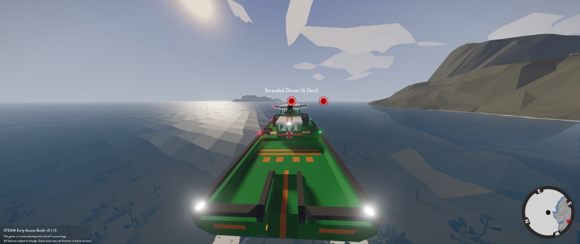 I’m not sure exactly how large the map in this game is, but it seems to stretch on for a long while, with relatively few islands compared to the sheer amount of ocean. This means objectives can be far away… very far away. Now, travelling 6km to save a stranded captain doesn’t sound too bad, right? At just under 15 meters per second in my day 0 cargo ship, this simple 6km trip took me about 7 minutes real time just to get the captain, then I had to turn around and drive another 6km to catch up with his runaway tugboat, another 7 minutes. A player should not have to listen to the monotonous growl of 4 petrol engines for almost 15 minutes for one mission. In this time, I was able to play a few rounds of “Lucky Trivia” with my new Google Home (who knew cats had 32 muscles in their ears?) but Stormworks is a game, you shouldn’t have to entertain yourself with something else while playing it; waiting around holding the W key for 15 minutes is not fun. This game desperately needs some sort of time warp or fast travel to waypoints (you can fast travel to your home bases, thankfully, but you have to manually travel to missions). I think this is currently the games biggest flaw, and it will probably be the reason I won’t progress in the game outside of messing around with Workshop vehicles in Creative mode. In case you were wondering, I never did finish that mission. I crashed into an island because I was on my phone not watching the game and managed to capsize my vessel whilst travelling to the tugboat. Immediate Alt+F4 ensued.