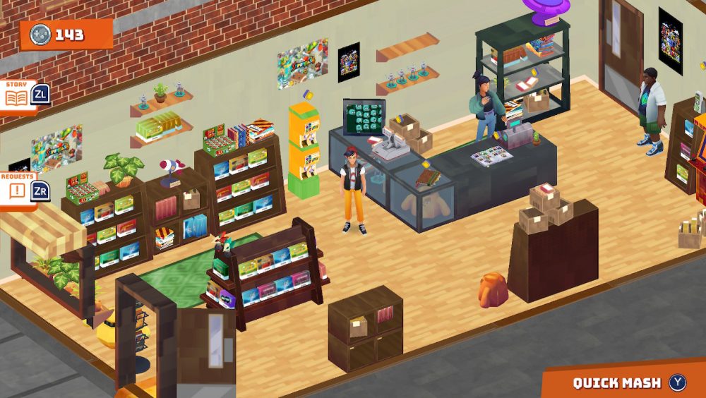 All this being said, I can’t imagine playing this game alone for long periods of time. Outside of the actual gameplay, which is often very short, nonsensical, and often unfair, the story mode isn’t much to dive into. You play a young man who runs a video game shop with his sister and uses the Super Mash machine to create randomized games to sell. You can upgrade your store and buy packs of dev cards to make your games more customizable. It feels a lot like a tycoon style flash game, but in a fun way. Upgrading your store and doing little story missions feels good, and I enjoy doing this on my own. But playing your own randomized games honestly doesn’t feel very good.