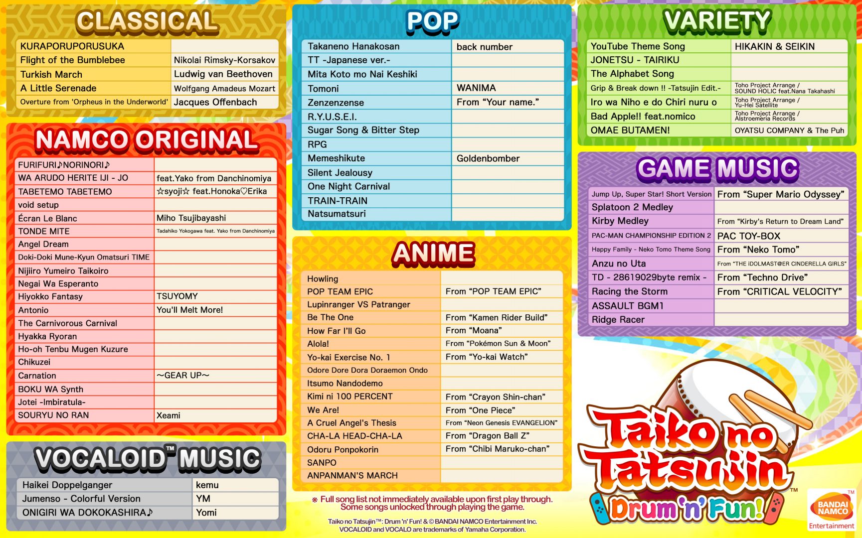 Taiko no Tatsujin: Drum ‘n’ Fun! for Nintendo Switch and Taiko no Tatsujin: Drum Session! for PlayStation 4 was recently announced for release on 2nd November 2018. Today BANDAI NAMCO has revealed the full tracklist.