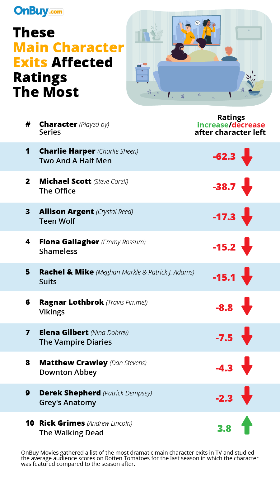 To do so, OnBuy Movies gathered a list of the most dramatic main character exits in TV and studied the average audience scores on Rotten Tomatoes for the last season in which the character was featured, compared to the season after.