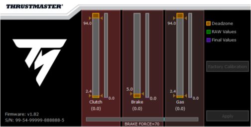 The dedicated calibration software for the T-LCM Pedals allows for electronic adjustment of the braking power, as well as customization of the dead zones on each of the 3 pedals: accelerator, brake and clutch.