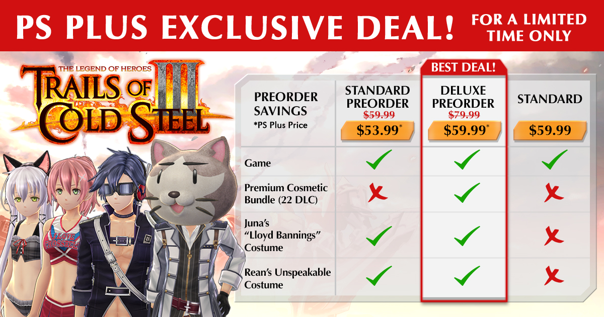 The Digital Deluxe Edition for The Legend of Heroes: Trails of Cold Steel III, available for a limited time, starts TODAY for PS Plus users! grab it from here.