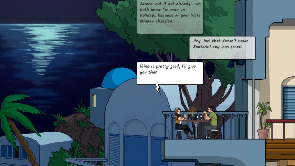 At the start of each loop, more information about what’s going on, along with more story and background information about our heroes, gets revealed. Along with exactly how your loops impact the Minoan past as well. A nice twist as well, is that new story locations and gameplay segments get added so that you’re not only travelling across Thera’s vast and wonderful environment. There’s a heist that you have to perpetrate without been caught and, a personal favourite, a rooftop escape from a police helicopter.