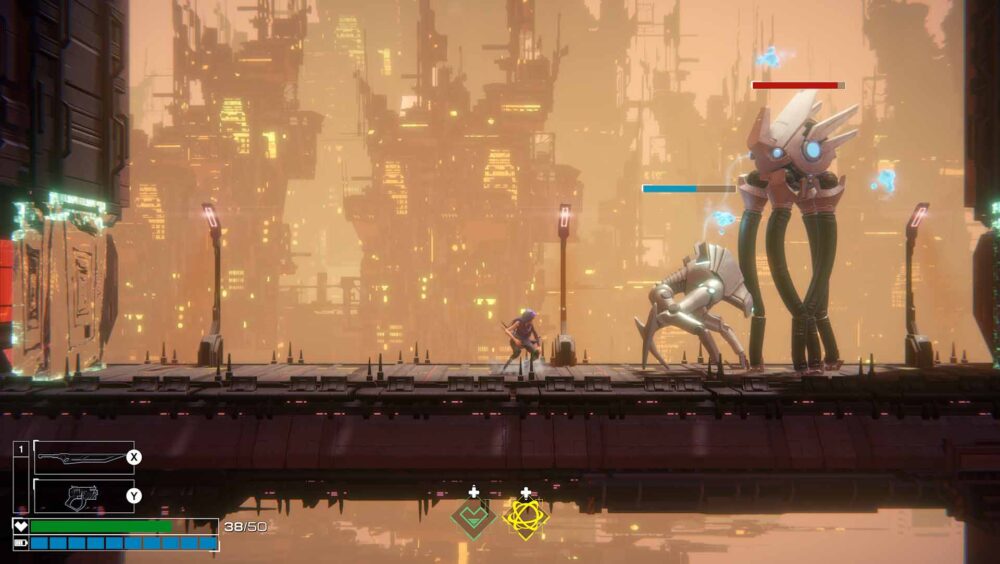 Now all of this is pretty much par for the course but where Trinity Fusion does throw its own flavour into the oven is with its multiverse setting, the playable characters and slight Metroidvania-level design that is procedurally generated.