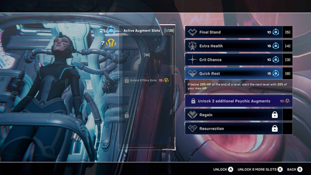 You won’t have access to all characters right from the get-go and will unlock them as you progress. Each character has a different starting weapon set or special ability such as a double jump or grapple arm and each one will start their runs in different areas of the game. Along with permanent stat boosts, each run will slowly unlock new abilities for your character until you get to the one major mechanic that really helped to make Trinity Fusion stand out: the eponymous fusion itself.