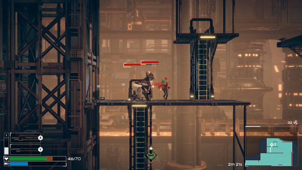 Scattered across the levels are machines that will let you fuse two characters together to create a new build to play with, while also increasing the amount of weapons at your disposal. Your basic set of three expands to six which you can swop in and out of easily while the fusion gives access to both of those characters’ abilities. If that double jump isn’t enough, then you can use that new grapple arm to get around.