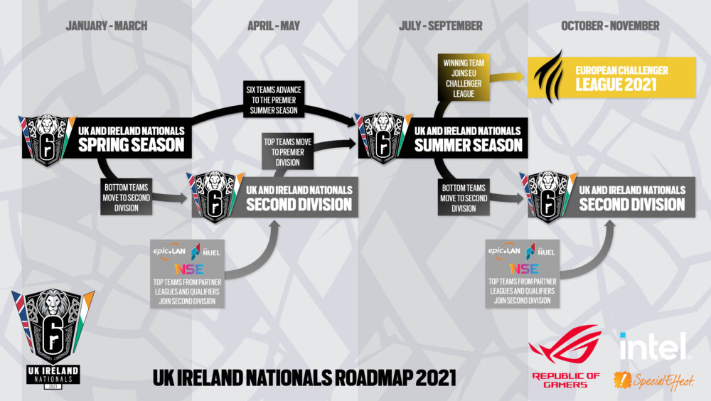 The UK Ireland Nationals Second Division will start up again towards the end of April 2021 with 10 teams: two relegated from the UK Ireland Nationals Premier Division, four qualifying from partner tournaments of epic.LAN 31, Belong UK, NSE and the NUEL’s spring seasons, and four from the open qualifier. Matches will play out throughout April and May, the top two teams from the playoffs will qualify for the UKIN Premier Summer Season 2021 and for the chance to qualify for the 2021 Challenger League.