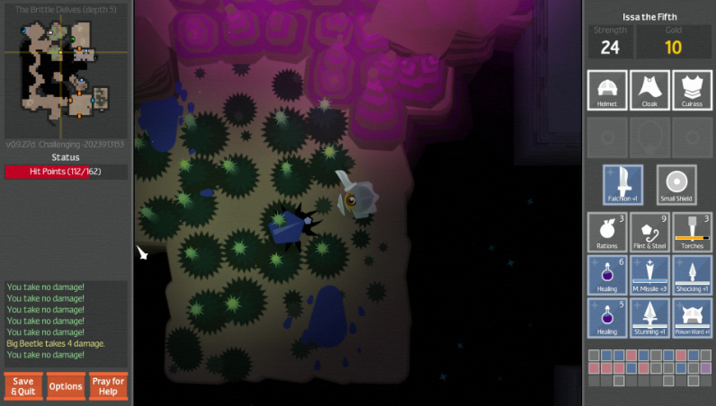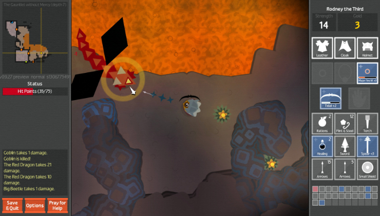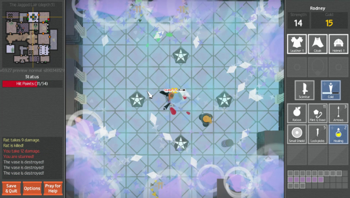 Unexplored starts us off with a short little introduction, our adventurer walks into a tavern, the start to many a great journey. We talk to an old man and he talks to us about our quest in the Dungeons of Doom, to find the fabled Amulet of Yendor. After some light customising of our character we can bribe the man for hints on the dungeon or buy items. From there it is a long delve into the dungeon, fighting through waves of enemies and descending the floors to its darkest depth to slay the dragon.