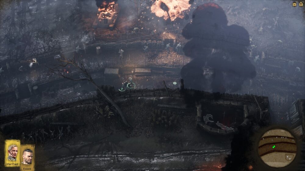 In War Mongrels, players will take on the role of two Wehrmacht soldiers named Manfred and Ewald. They are caught up in the “Eastern Front” against Soviet Russia and War Mongrels drives this fact home to you quite early with trenches being bombed. Manfred and Ewald soon defect from the German war machine when their companions they were travelling with are killed in a truck explosion. This is not a game for the faint of heart and there are some incredibly brutal scenes throughout the game. Not to mention the game’s subject material itself being quite heavy involving death, murder, torture and war itself.