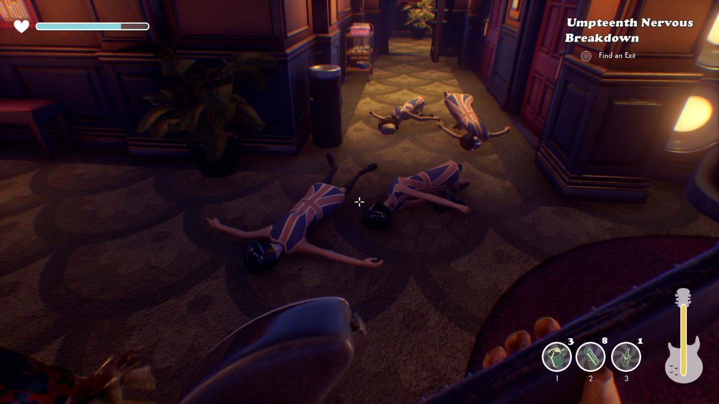 The Lightbearer DLC changes up combat in We Happy Few quite a lot. Gone are the melee weapons. There are no cricket or baseball bats here. Instead, our hero will have to use his Electric Guitar to defeat enemies. Nick can effectively play a series of tunes to face melt enemies. This drains his guitar amp’s charge though and the only way to recharge it is to play a vibe right before you’re about to be attacked. Players will have to fire off riffs and then wait to “block” an attack with a vibe to replenish their energy. Battles play out in a really fun way because of this.