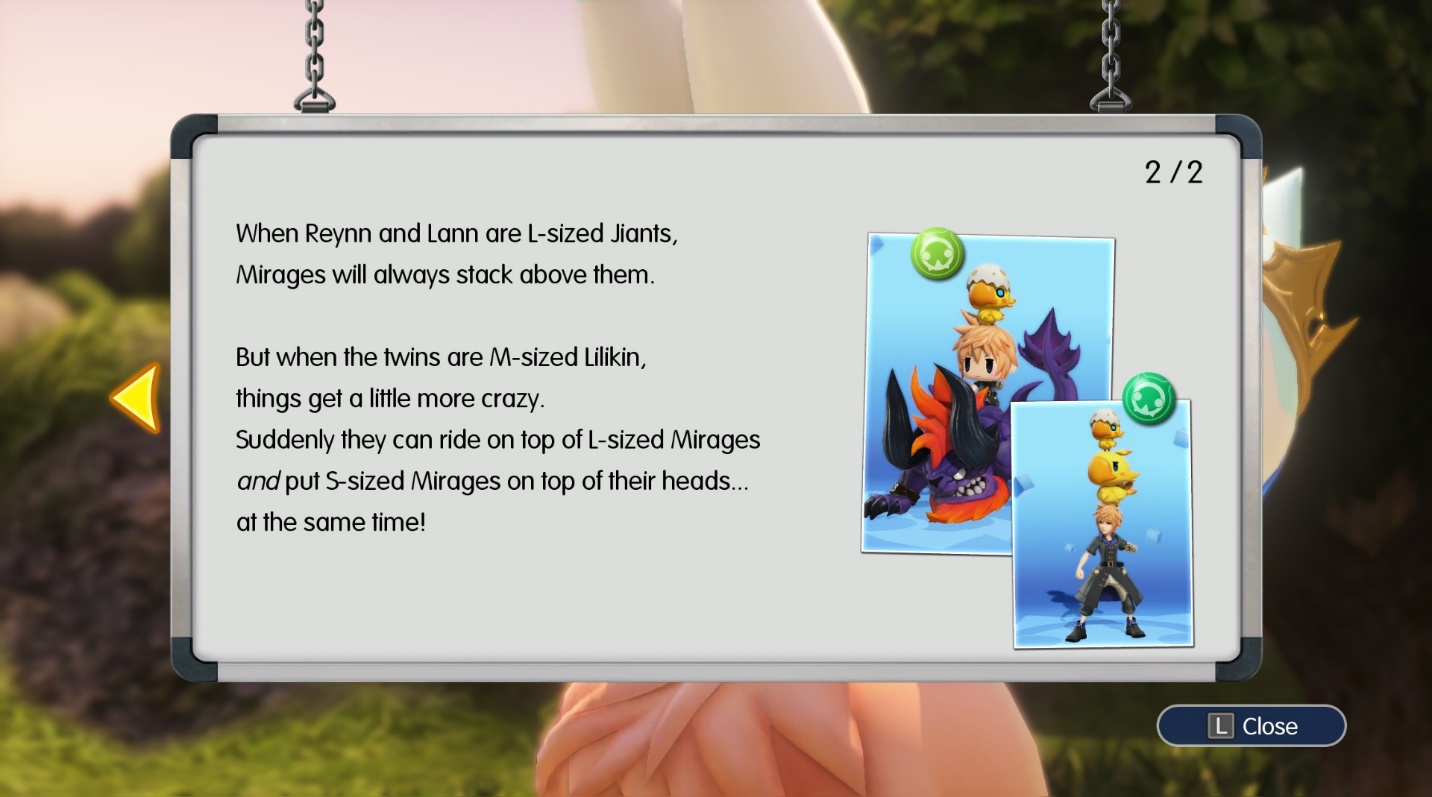 World of Final Fantasy’s gameplay features a mix of the Final Fantasy franchise’s Active Time Battle system as seen in FFX-2 onwards and micro-management “Stacking”. Players can opt to use the more traditional fully turn-based battle system by selecting “Wait” mode instead of using the “Active Time” mode. Stacking is a feature unique to World of Final Fantasy in which players can stack mirage monsters on top of the main characters for added benefits such as increased attack power or HP. The caveat being that stacking reduces the number of characters in battle. Stacking also employs a set of rules that involve placing characters depending on their size on top of each other. Large characters for example have to be at the bottom with medium and small stacked on top.