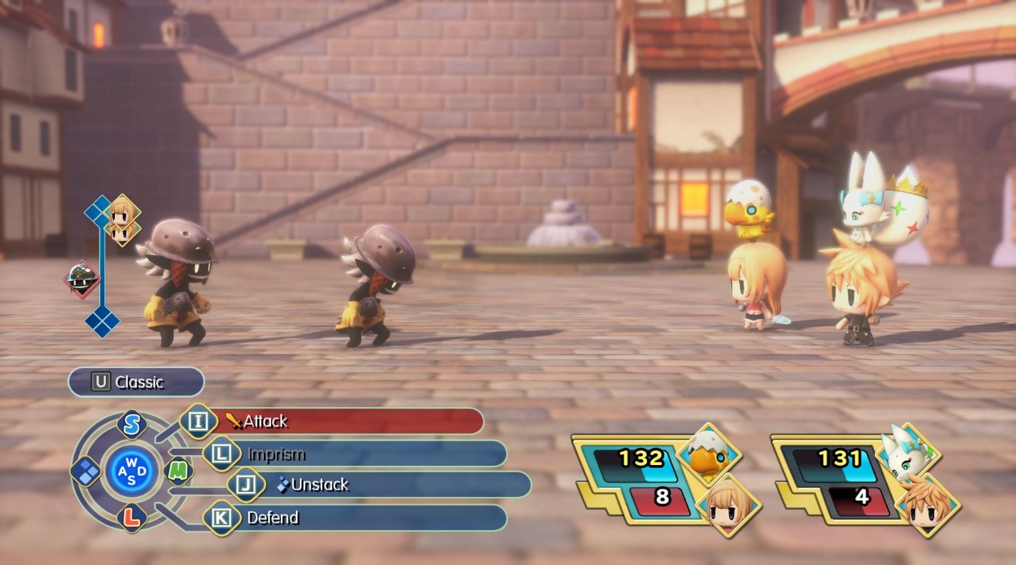 In World of Final Fantasy, the player’s two main characters, Lann and Reynn can assume two forms, Lilikin and Jiant. Lilikin is a chibi or miniature form and Jiant is a more normal form. Playing in the chibi form allows for stacking yourself on top of larger mirage monsters and learning to utilize stacking to its fullest is a key component of World of Final Fantasy’s battles. Additionally, battling features the standard fare as expected from a Final Fantasy game with spells and summons being available too.